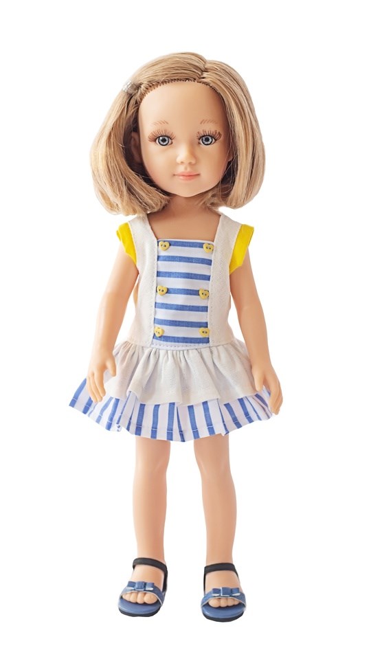 Очаровательная голубоглазая Бланка с удлиненным каре любит море и мечтает о путешествиях. В своем коротком белом платье с яркими вставками, декорированном маленькими желтыми пуговками-сердечками, и синих босоножках с тонкими ремешками она может с удовольствием гулять по палубе корабля, любоваться морскими пейзажами и ловить встречный ветер.